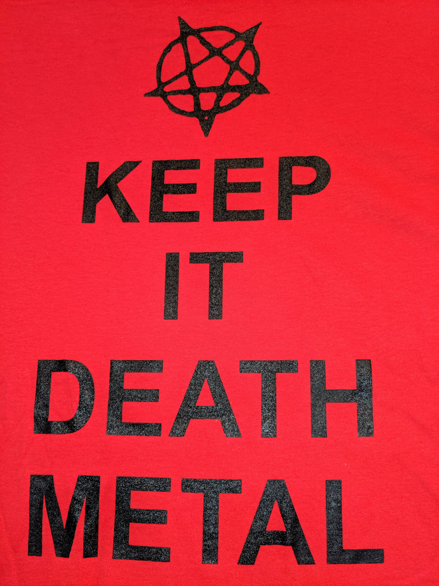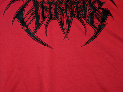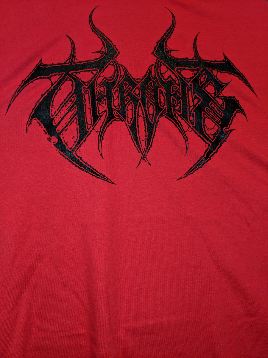 Black on red T-shirt printed on Gildan brand apparel. 100% Cotton. Front and Back designs. Logo art by Raoul of View from a Coffin.